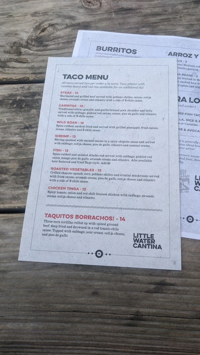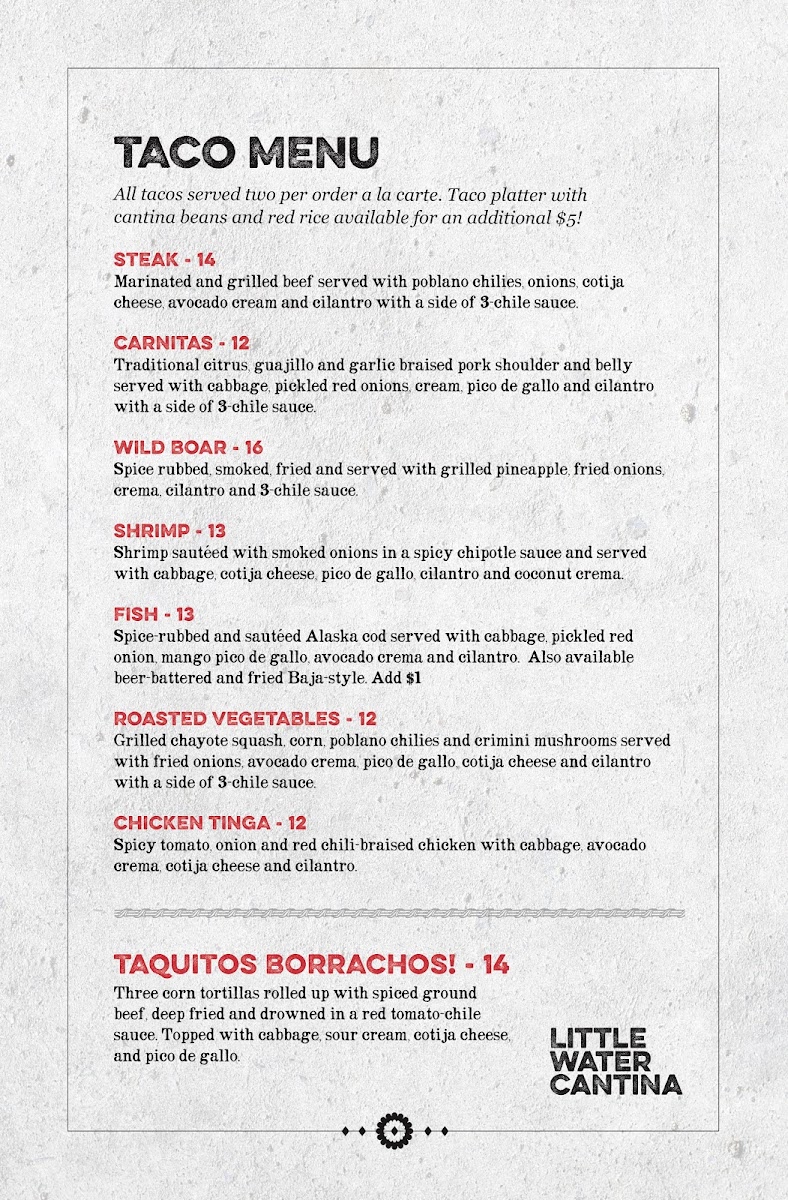 Little Water Cantina prides itself on a menu brimming with Mexican classics and seasonal delights. Guests rave about the Wild Boar Burrito, described as "crispy, smoky magic," and the succulent Shrimp Tacos that deliver a delightful coconut-chipotle flavor. Each dish reflects the passion and creativity of the kitchen, ensuring that even the simplest items, like chips and guacamole, become a memorable experience. One customer mentioned they could "inhaled the only chips" worth the price—an endorsement that truly speaks volumes!